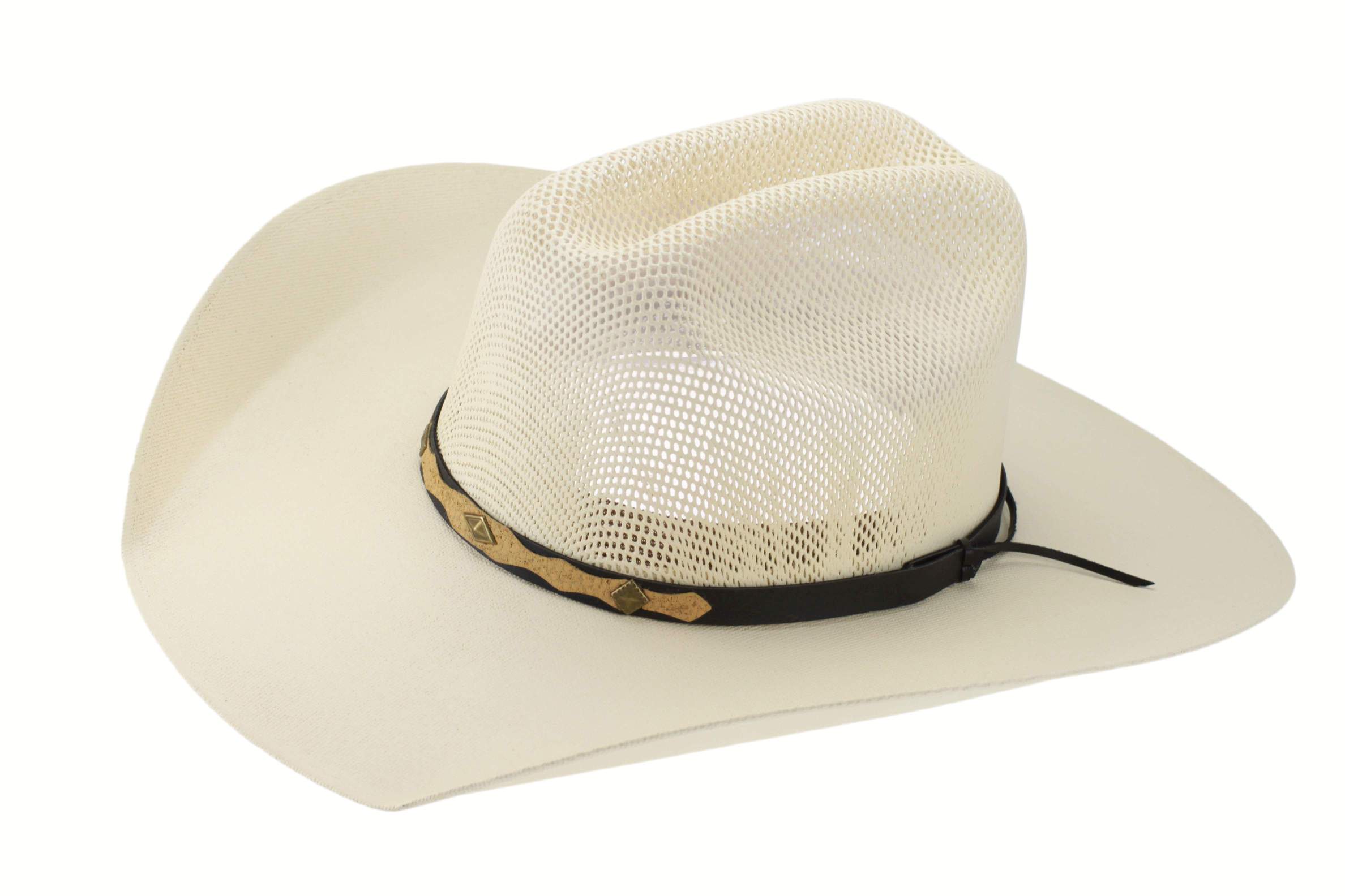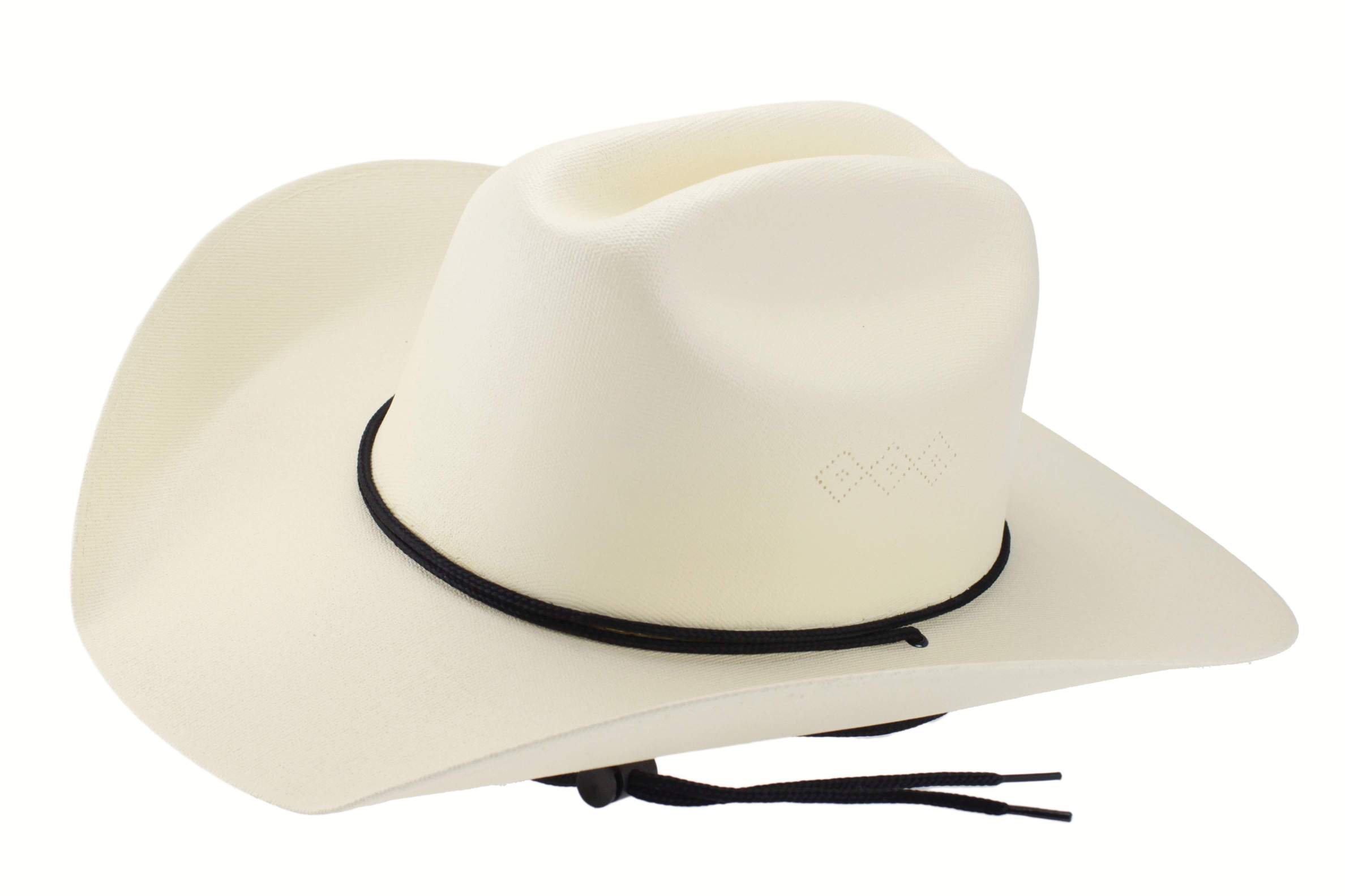 Hat quality 100X, entirely handcrafted, 7.6 ounces, 100% beaver fur felt, guaranteed waterproofing treatment, leather sweatband, satin lining, silk hem, adorned with detail of printed leather...